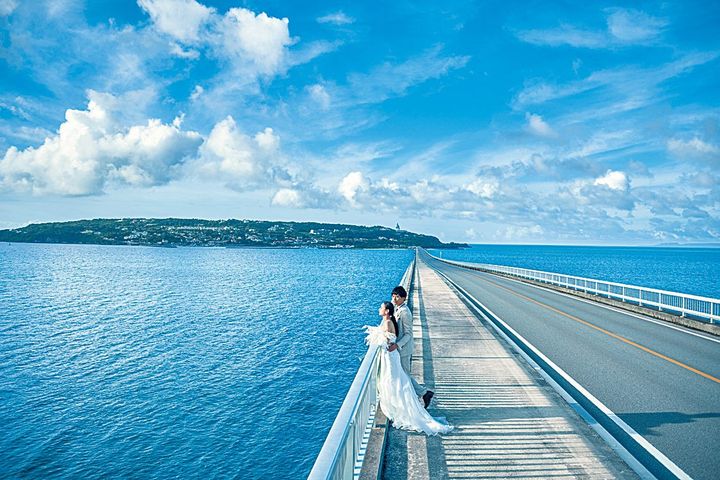 沖縄北東部にある古宇利島はエメラルドブルーの海に囲まれた小さな島。離島ならではの雄大なロケーションを舞台にセレモニーを叶えることができます。本島と橋でつながっており、チャペルにはパーティ会場が隣接しているのでアクセス、移動もスムーズなのが魅力。