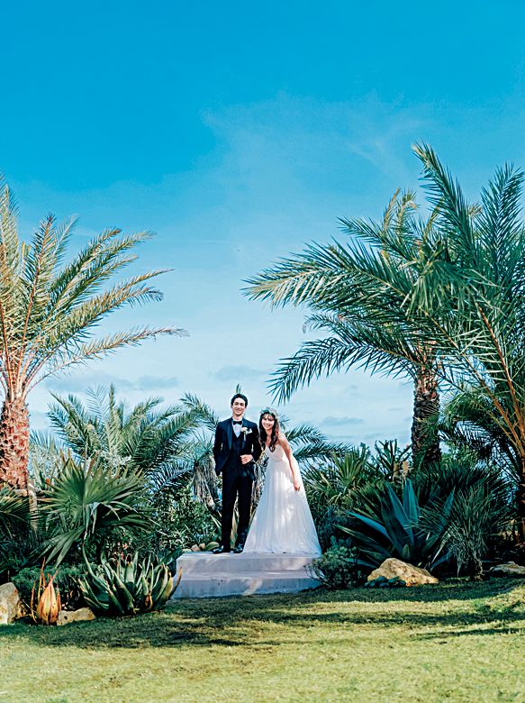 チャペルの周辺にはさまざまなフォトスポットが。ヤシの木に囲まれて南国らしい一枚を。