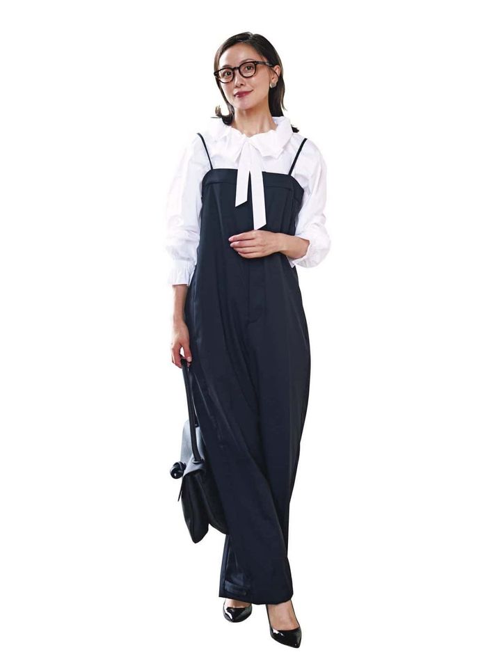 キャミオールインワン¥59,400(デパリエ)ブラウス¥29,700(デパリエ)バッグ¥59,400(ヴァジック/ヴァジックジャパン)靴¥26,400(銀座かねまつ/銀座かねまつ6丁目本店)メガネ¥42,900(アイヴァン/アイヴァン 東京ギャラリー)ピアス各¥23,100(マユ/マユ ショールーム)