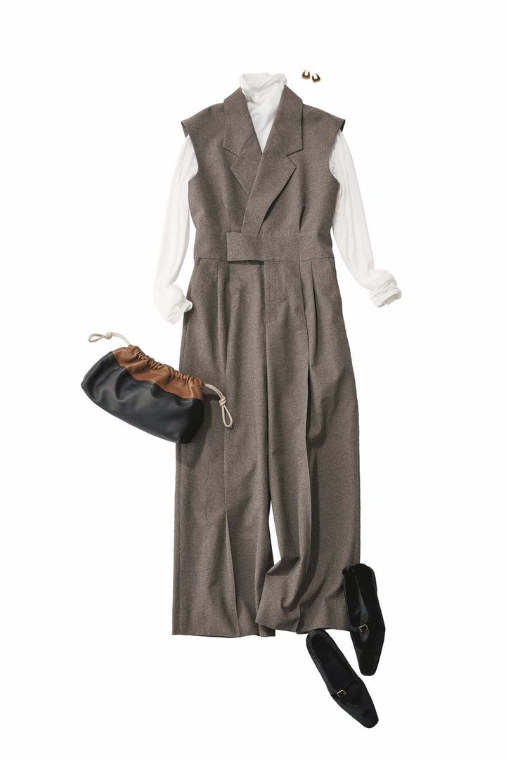オールインワン¥49,500(エモエレ/ジュンカスタマーセンター)カットソー¥16,500(LE PHIL/LE PHIL NEWoMan 新宿店)バッグ¥145,200(ピエール アルディ/ピエール アルディ 東京)パンプス¥35,200(ペリーコ サニー/アマン)ピアス¥4,290(ieLS/ロードス)