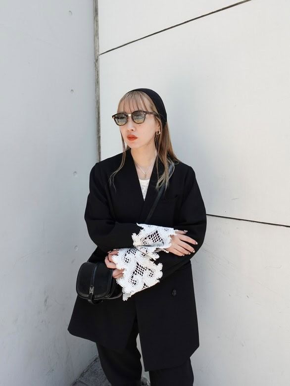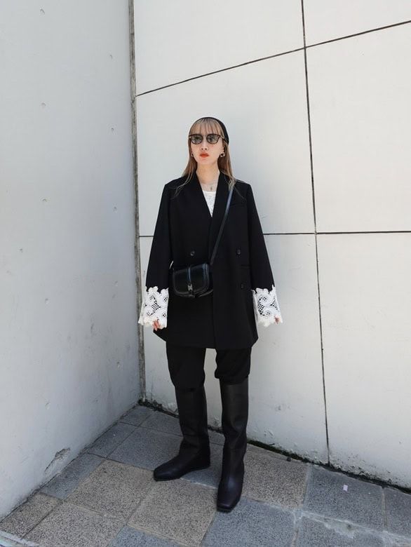 「大好きなモノトーンコーデです。オーバーサイズのジャケットは袖口のレースがポイント♡ ジャケットを主役に、ロングブーツを合わせてトレンドを意識しました。インナーやパンツはタイトなアイテムにして、メリハリをつけてみました」(MARTE/saharaブランドマネージャー、SYKIA デザイナー三好香織さん)