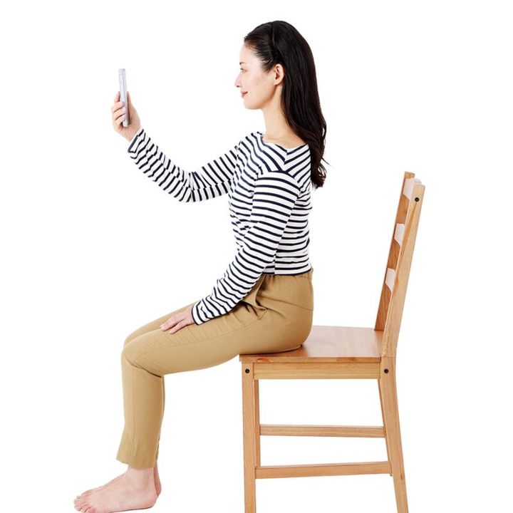 立ち姿勢と同様、背中も肩も丸まらずまっすぐな状態。長時間のスマホ使用により姿勢が悪くなる人が増えていますが、スマホを目の高さくらいに持つ、あごをひくよう意識するなどすれば、悪い姿勢を予防できます。