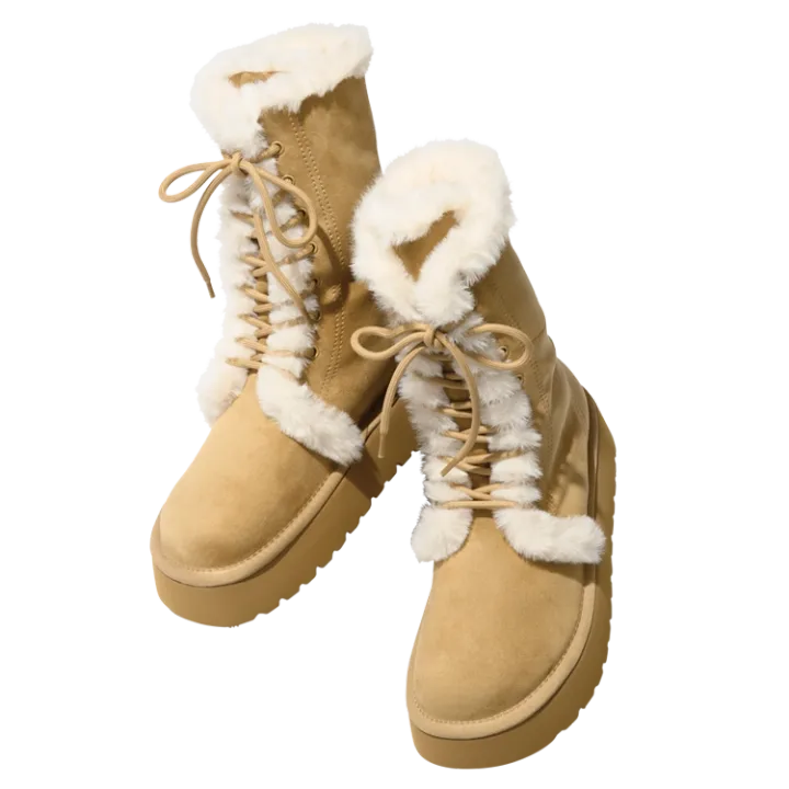レースアップデザインとボリュームのあるプラットフォームソールが印象的なミッドカーフブーツ。クセありムートンが斬新♡