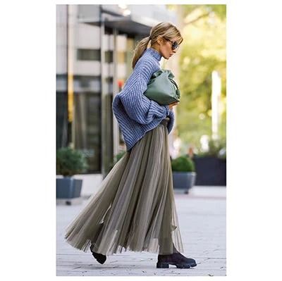 旬の短め丈は、長さがないぶん「ゆるい」というよりも「ぶかぶか」くらいのシルエットに向くタイプ。着回しやすい色はくすみがかった色味。中でもグレーに近いようなブルーは万能。ざっくり編みのオーバーニット&ボリュームブーツを合わせ、チュールスカートの特別感と甘さを軽減。