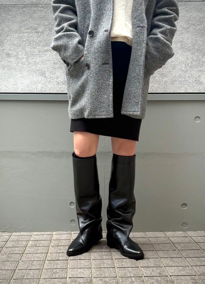 太めの筒とカバーブーツのような立体的な足首のカーブ、ラクチンにはけるフラット仕様に「待ってました!」と即買いしたブレンテッラのロングブーツ。流行に関係なくロングブーツは大好きなのですが、身長155㎝の低身長に加えて肉付きもよくO脚も目立つ脚のため、なかなかスッキリとはけるブーツに出合えず、見つけたときは本当に嬉しくて。美脚に見える(正しくはカムフラージュできる?)ブーツのシルエットはもちろん、はきこむほどになじんで風合いが増す上質なスムーズレザーもポイント。それもそのはず、ブレンテッラのシューズは高級メゾンと同じ生産背景で熟練した職人によって作られているのだとか。ミニスカートのみならず、ロングスカートやウールのレギンスをブーツインするなど、その筒の太さを活かしていろいろな楽しみ方ができそう♡