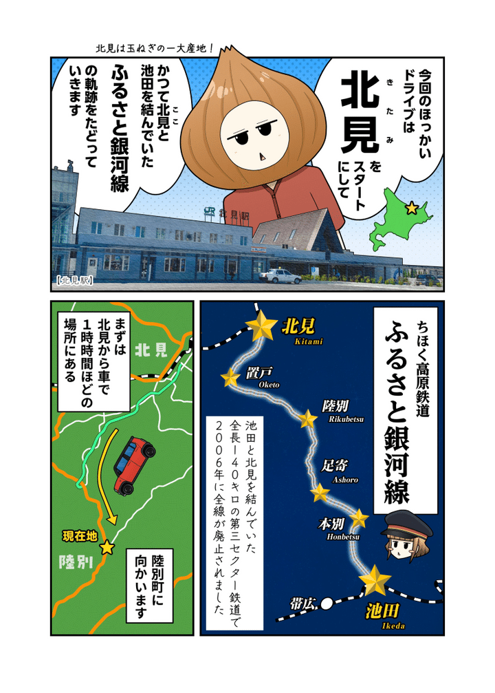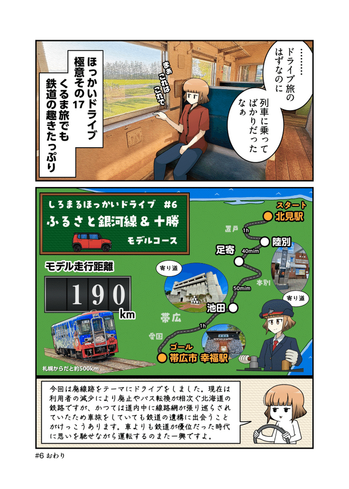 『しろまるほっかいドライブ』の第6回は、北見から十勝方面へのドライブです。今回は旅のテーマに鉄道を取り入れ、かつてのふるさと銀河線と国鉄広尾線の遺構を作中に登場させています。