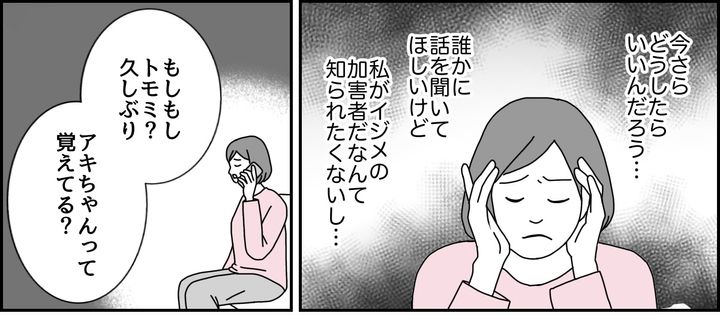誰かに話を聞いてもらいたいのですが、私がいじめの加害者だったことを明かすことになるので、ためらってしまいます。夫にもママ友たちにも相談したくありません。こんな様子で数日悩んだ末、私は地元の友だち(トモミ)に連絡しました。