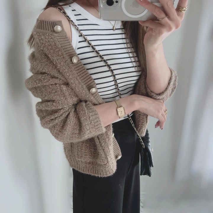 @aiai.miniさんのように、秋はタンクトップの上からさらりと羽織るのもいいでしょう。カーディガンのゴールドボタンに合わせ、アクセサリーや時計、バッグの金具もゴールドで統一されており、温かみのある高見えコーデに仕上がっています。