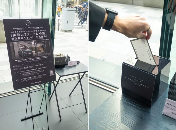 3メートルの猫の愛称を募集するキャンペーンも実施。2025年10月23日(木)~11月27日(木)の募集期間中に、NISSAN CROSSINGの店内に設置された投票ボックスから、またはSNSでハッシュタグ「#オーラに寝そべる3メートルの猫」とともに愛称を投稿すると応募ができます(※)。奮って応募しちゃいましょう!