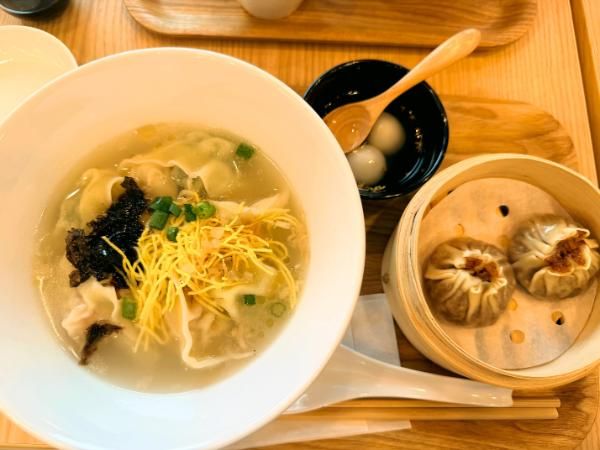 今回は鶏ガラスープの大饂飩(中の具は薺と海老)を注文。サイドには「上海糯米シュウマイ」をセットにし、スイーツは「黒胡麻湯円」を選びました。
