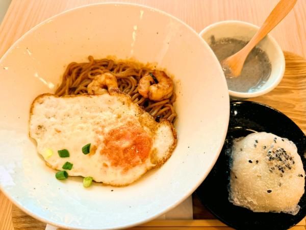 葱油ソースは香ばしく甘みがあり、海老と目玉焼きがアクセントに。スイーツの「黒胡麻糊」は温かい黒胡麻のお汁粉のようで、とろっとした食感が楽しいひと品です。