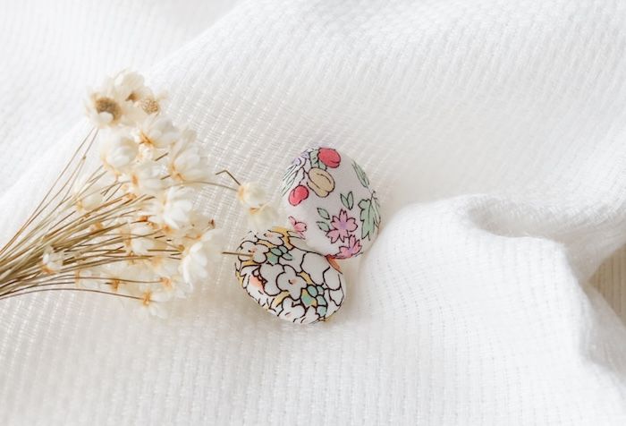 小さめサイズのくるみボタンは、アクセサリーにもぴったり。 裏面にフェルトとピアス(またはイヤリング)パーツを貼り付ければ完成します。 布を選ぶ楽しさがあり、季節感や自分らしさを気軽に表現できます。 金属アレルギーが気になる方は、アレルギー対応パーツを使って仕上げてみてください。