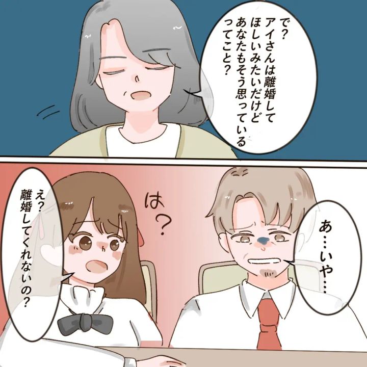「で?アイさんは離婚してほしいみたいだけど、あなたもそう思っているってこと?」私がそう言うと、「あ・・いや・・」と言葉を濁す夫を見て、「は?え?離婚してくれないの?」とアイさんが言いました。