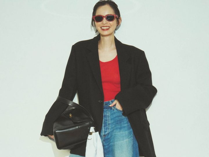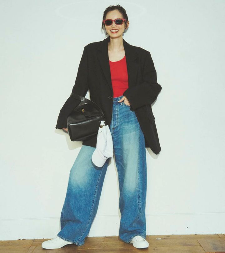 脚のラインを程よく隠しながら旬な印象を与えるバルーンデニムは大人の強い味方。長めのレングスなら足元がスニーカーでもバランスよくはけます。やっぱり赤とデニムって最高に可愛いじゃありませんか♡