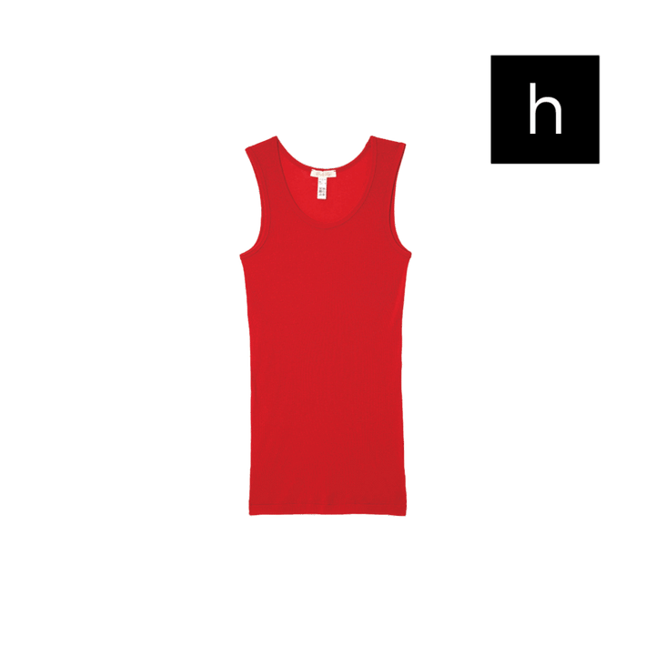 タンクトップはトレンドカラーでもある赤をチョイス。ボディラインにフィットする細身のシルエットで着心地も抜群。¥12,100(スープレ ルース/メイデン・カンパニー)