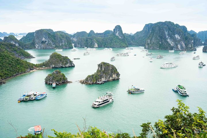 クルーズ船で出発してから少し経つと奇岩群がその姿を現し、目の前に迫ってくるような迫力が感じられます。2,000もの奇岩と1,000の島からなるハロン湾は、一面に点々と奇岩や島が広がり、自然の脅威を感じられる風景。