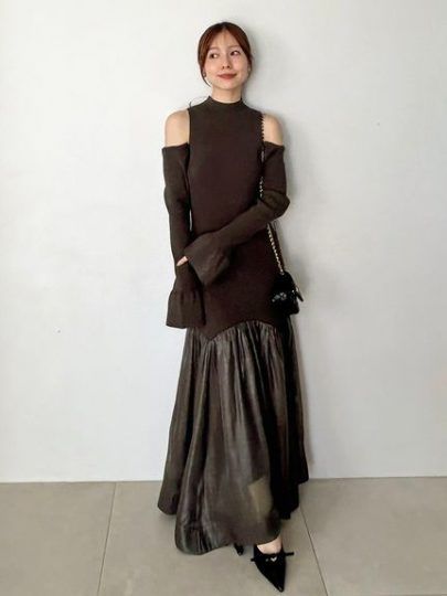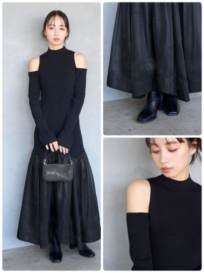 シンプルながらも1枚でドレッシーなコーデが完成するロングニットワンピ。ストンとしたマーメードシルエットで、程よいサイズ感がボディラインを拾いすぎないながらも美スタイルへと導きます。首元はややハイネックで、大胆にカットしたカットショルダーでヘルシーな肌見せ感をプラス。手先までの長めのベルスリーブ、膝下位置から裾にかけてギャザーをたっぷり入れたオーガンジーのスカートがシックな印象を盛り上げます。