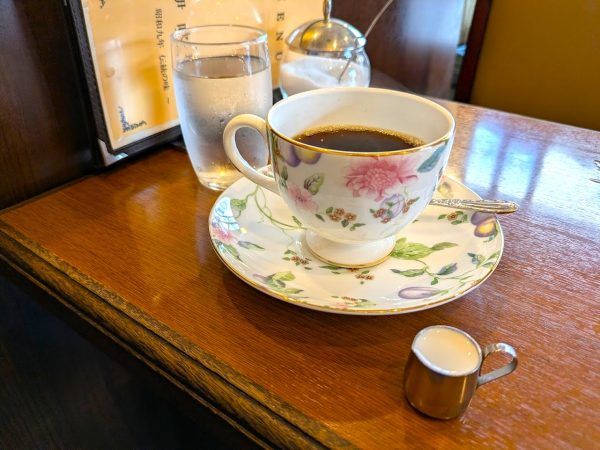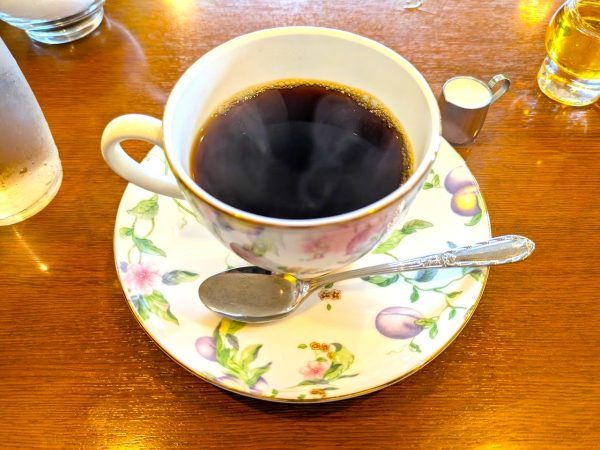 コーヒーは、ホットコーヒー・マイルドコーヒー・アメリカンコーヒーの中から選ぶことができます。その中からマイルドコーヒーを選びました。コクのあるおいしいコーヒーですね。ちなみにカップ&ソーサーはウェッジウッドです。キレイですね。