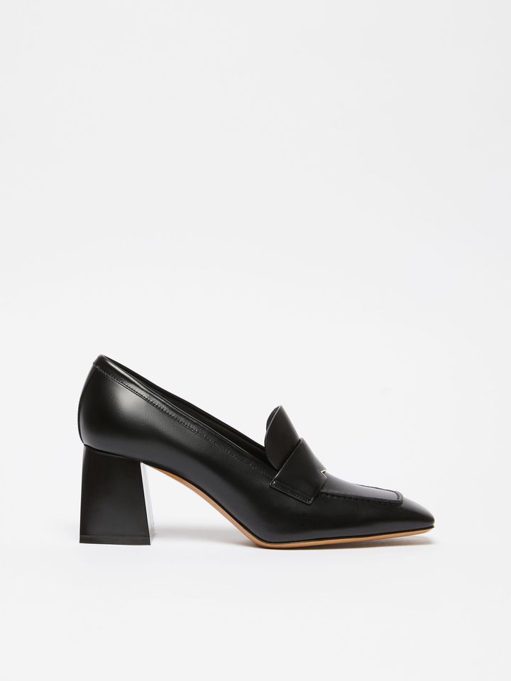 ローファーのストラップ部分をスリークな1枚のレザーパネルで、スリークな印象に仕上げたマックスマーラのヒールローファー。エレガントな足もとを演出する、スクエアトゥーもポイントだ。