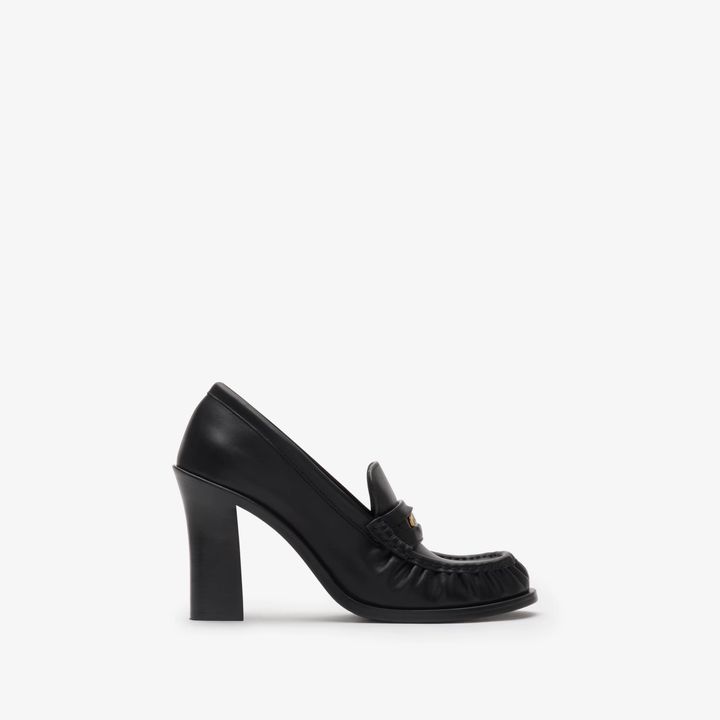 バーバリーのヒールローファーは、フロントに1980年代のバッグにあしらわれていたアーカイブモチーフ「ナイトスタンプ」のプレートを配し、サイドには手縫いステッチによるギャザーを施したデザイン。そこにカーブを描くブロックヒールを組み合わせ、クラシックとコンテンポラリーが共鳴する、メゾンの歴史を映し出す1足に仕上げている。