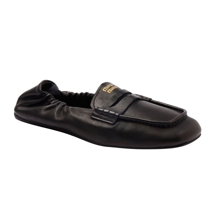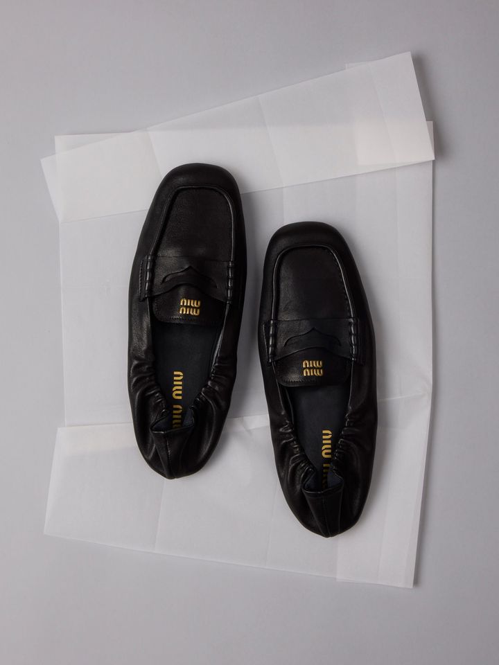 履き口にルーシング加工が施されたミュウ ミュウのローファー。クラシカルなフォルムを軽やかなナッパレザーで仕立て、ほどよくカジュアルな表情に。履くとクシュっとする絶妙なシワ感もコーディネートのポイントに。