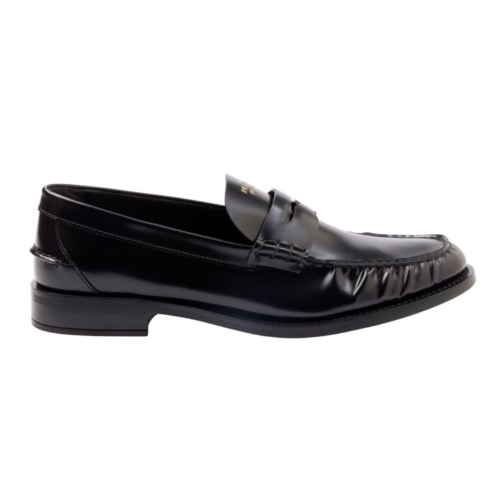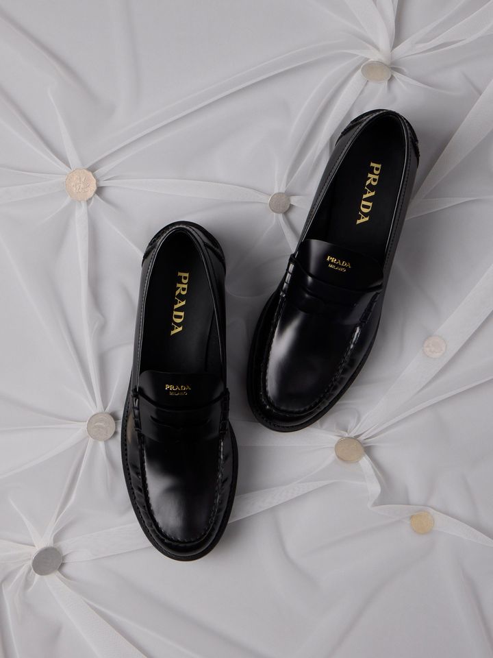 プラダの黒ローファーは、タイムレスなシルエット美が特徴。ランウェイにも登場した王道の1足は、タンにプリントしたさりげないゴールドロゴがポイントだ。