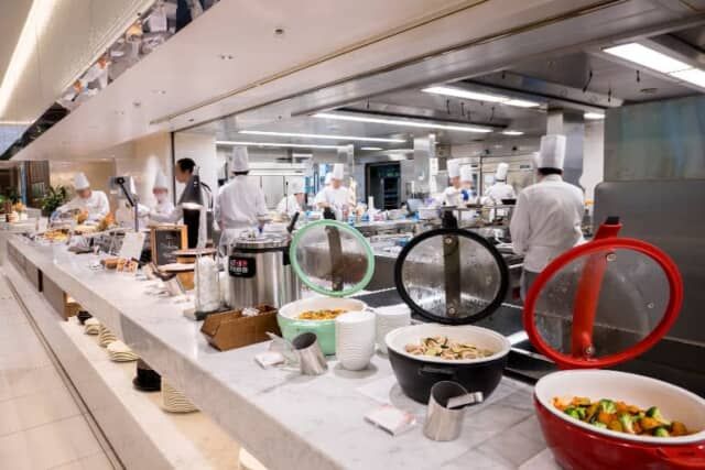 オープンキッチンも備えたブッフェ台には、スイーツやセイボリーが並ぶほか、モンブランやクレープなどのライブキッチンも用意され、あつあつの出来立てを用意します。