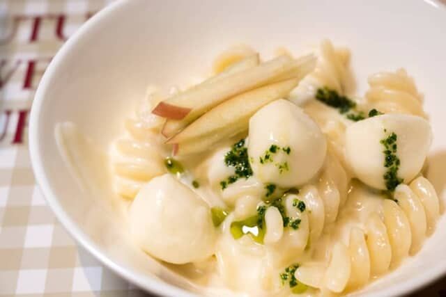 ショートパスタの “フジッリ” にはモチモチのモッツァレラチーズがちりばめられ、ジェノベーゼソースがかかります。さりげなくトッピングされたりんごのシャキシャキ食感と爽やかな甘味がアクセント。ひと口食べて「おっ!」と声がでてしまう一皿です。