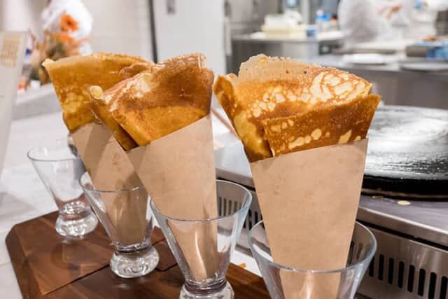 第三次ブーム到来中のクレープは、生クリームなしでシンプルにバターと砂糖のみ。しかもライブキッチンで出来立てをいただけます。米粉を使って軽やかにパリッと食べられるクレープは、忘れずに試してみてください。