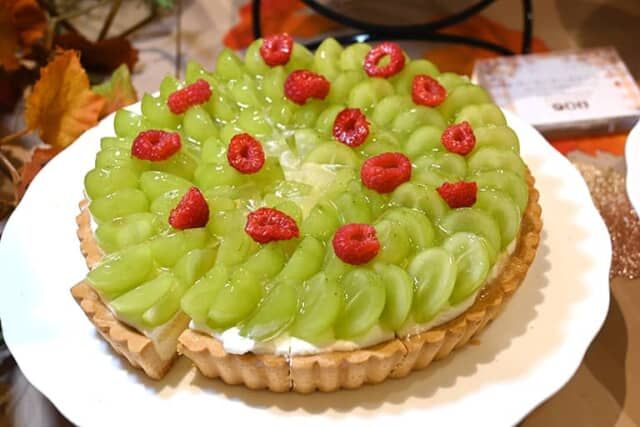 ぎっしり盛り付けられたシャインマスカットが美しいタルトは、みずみずしい果肉とサクッとしたタルト生地の組み合わせ。1ピースのサイズも大きく満足感たっぷりの逸品です。