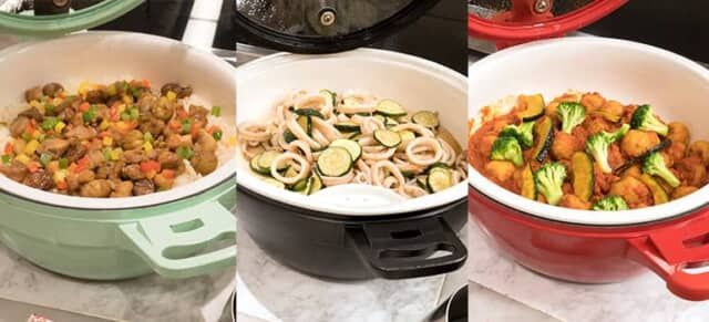 ホットディッシュは写真左から、チキンや栗がたっぷりトッピングされた「ほくほく栗とチキンのピラフ」、香りのいい「いかとズッキーニのトリフォラーテ」、イタリア風ミートボールの煮込み料理「ポルペッティー二 トマトソース仕立て」。