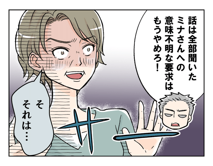 アイリちゃんとナツキくんは、ミナさんの実家に預けてきたそうです。こうしてサカエおばさんの、「不当な要求」に関わりのある大人がすべて揃いました。まずはサカエおばさんの弟であるお義父さんが、もうやめるようしっかり言います。こんなとき、何も考えずに自分の姉の味方をして、嫁を責める義父も世間にはいるでしょう。しかしミナさんのお義父さんは、息子のお嫁さんをちゃんと守ろうとしてくれています。どちらが正しいかちゃんと判断できる聡明なお義父さんでよかったですね。