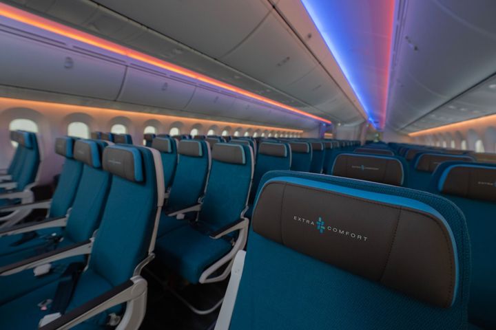 足もとのスペースが広い席に座りたいときは、エクストラ・コンフォートがおすすめ。エコノミークラスに15,000円前後の追加料金で片道からアップグレードできる。エコノミークラスより足もとが12㎝以上広く設定されているから、長時間のフライトでも快適。天井には、目的地の時間帯に合わせた太陽光の色が投影される。