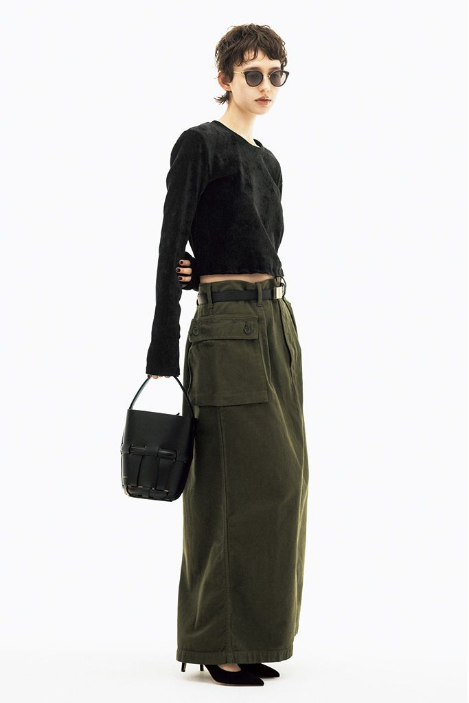 ワークパンツをそのままスカートにしたようなドライな質感の幅広シルエット。通常のカーゴパンツよりも上に大きなポケットを配置することで、自然と脚が長く・華奢に見える視覚効果を発揮。センターやサイドにまっすぐなシームをあしらうことで、味のあるカーキでも野暮ったさなくすっきりと。