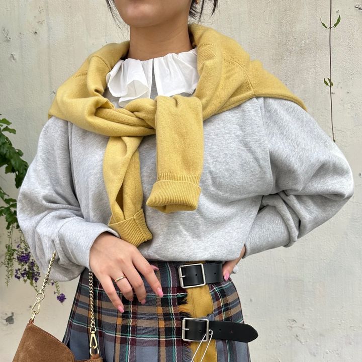 イエローのニットを肩にかけることで奥行きのある、表情豊かなレイヤードが完成します。