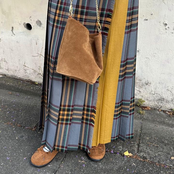 「小物はトレンド感のあるスウェード調で揃えました。AULENTTIとの別注バッグは、ゴールドチェーンでアクセントを効かせているところがお気に入りです」
