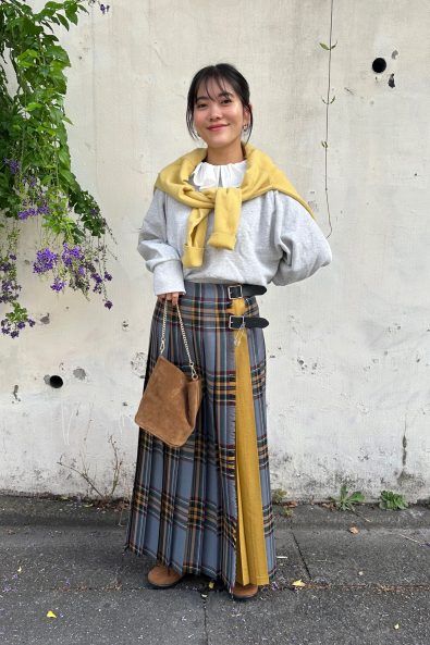 「主役のスカートを引き立てるように、色合わせと素材感で秋らしさを意識しました。スカートに配色されているイエローをトップスに取り入れ統一感を出したところもポイントです」