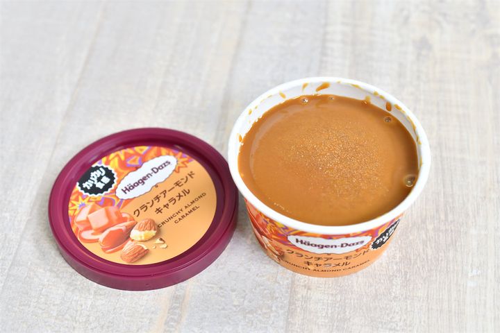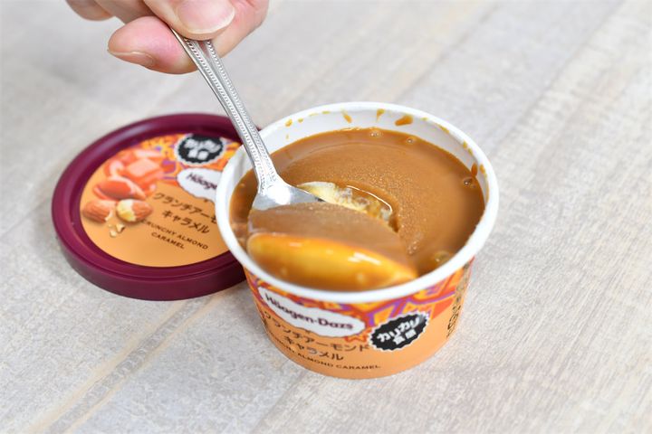 フタを開けた瞬間から幸せな気分になれる、とろ~りキャラメルソースと、食感が楽しいカリカリアーモンドの組み合わせが最高なんだそう。
