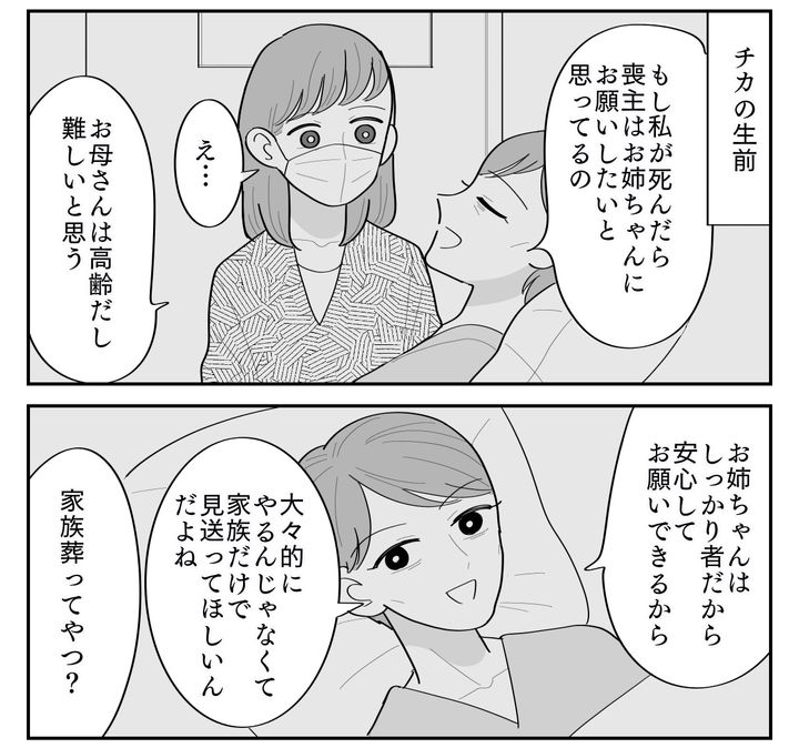 私はユカ。結婚当初から実家で同居していて、子どもたちが独立した今は母と夫との3人暮らしです。薬局を経営していた父が亡くなると、病院勤務していた薬剤師の妹チカが父の薬局を継いでくれました。しかし1年ほど前、妹に大きな病気が見つかったのです。妹が独身でひとり暮らしだったこともあり、闘病中は私ができるかぎり寄り添って支えてきました。入院していたとき、妹は冗談まじりに「自分が希望するお葬式のスタイル」を私に語っていました。