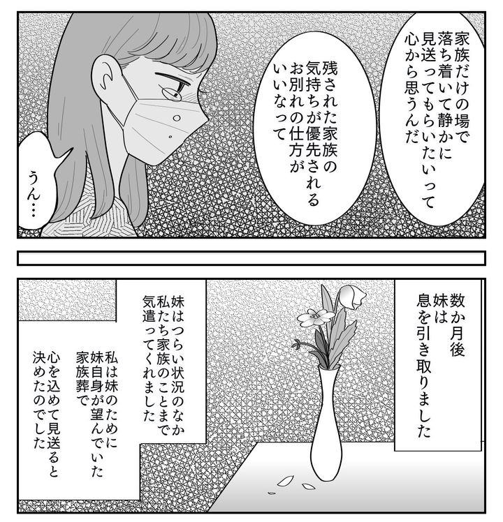 もし万が一のことがあったら家族だけで静かに見送ってほしい……。妹はそんな思いを私に託していました。父の葬儀での経験から、自分のときはあんな思いを家族にさせたくないと思ったのでしょう。病気でつらい状況にあるにもかかわらず、妹は最期まで家族のことを考えてくれていました。