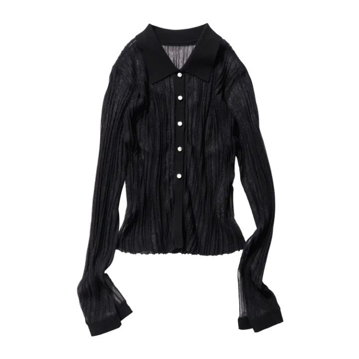 えりつきだからカジュアルなボトムとあわせても、上品にシフトできる。透け素材越しに見える肌でメンズのフェチ心をくすぐって。