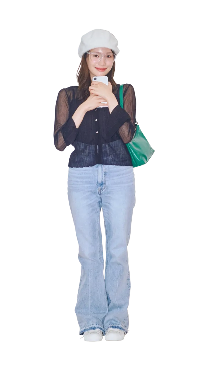 黒のシアートップスにデニムをあわせたシンプルコーデは、ベレー帽やカラーバッグで遊びをプラス。