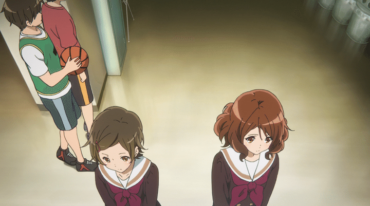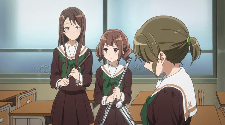 廊下ですれ違ったバスケ部員の話を聞きつけ、こっそりフルートのパート練習を覗きに行った久美子(CV:黒沢ともよ)と葉月(CV:朝井彩加)。