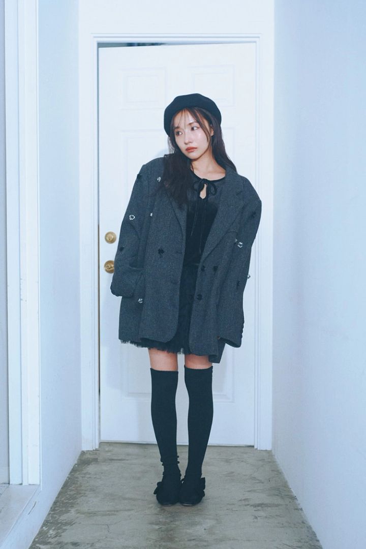 ツイードフラワービッグジャケット 39,600円/The Girls Society ブラックベロアチュールミニワンピース 27,800円/HONEY MI HONEY ベレー帽 5,280円/レイ ビームス(レイ ビームス 新宿)ニーハイソックス 2,750円/RESEXXY フラットシューズ 48,400円/ケイト・スペード ニューヨーク(ケイト・スペード カスタマーサービス)
