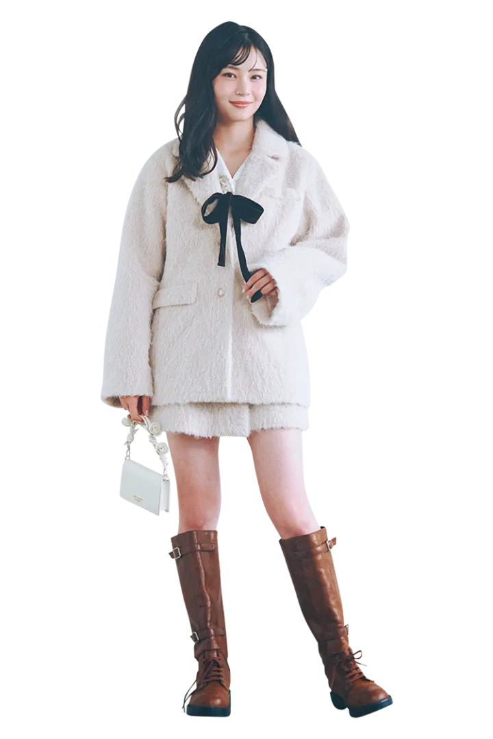 アイボリーミドルウールジャケット 26,400円、同素材ミニスカート 13,750円/ともにdazzlin 花柄ボウタイブラウス 17,600円/リランドチュール バッグ 29,700円/ケイト・スペード ニューヨーク(ケイト・スペード カスタマーサービス)ブーツ 16,900円/チャールズ&キース(チャールズ&キース ジャパン)