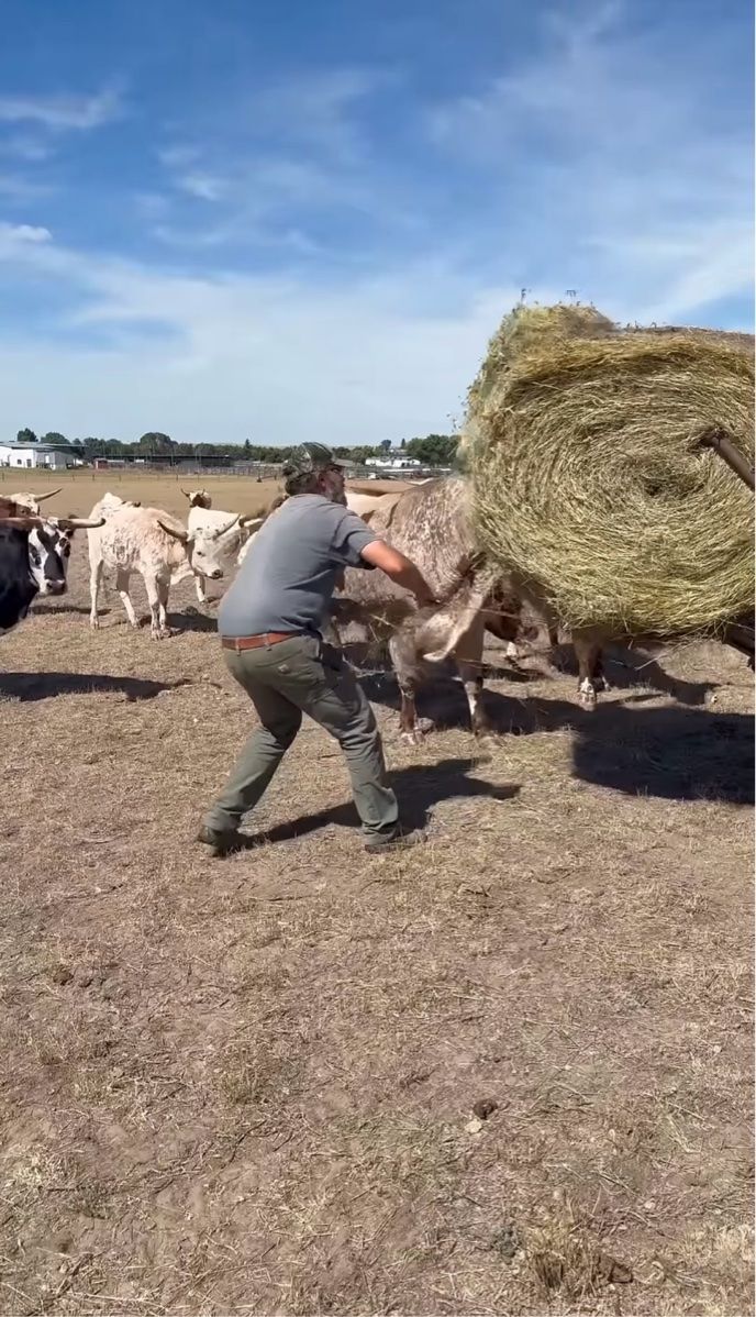 巨大な角が大活躍!男性が干し草を手でほぐしていたら・・雄ウシに後退させられた!?【アメリカ・動画】