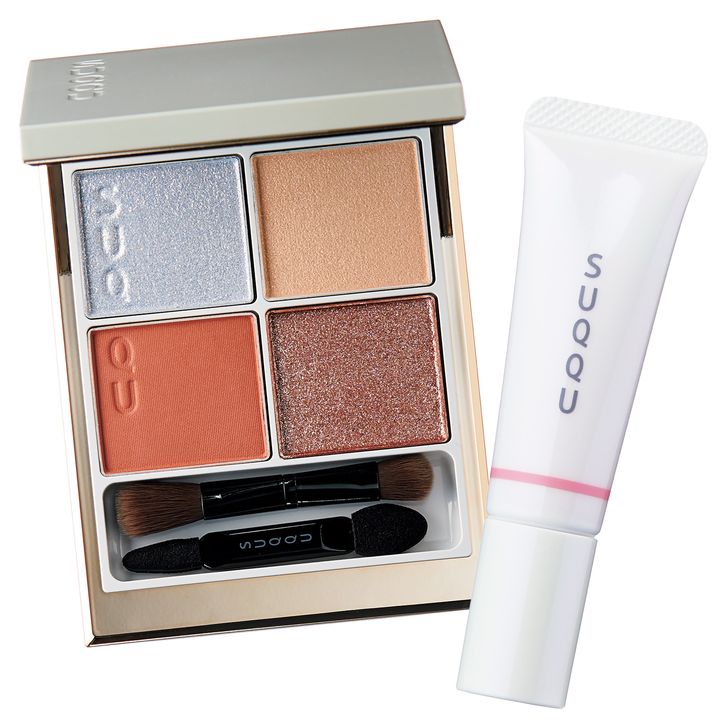 ブランドを象徴する人気のアイシャドウパレットと、滑らかでみずみずしいテクスチャーのリクイドチークがセットに。やわらかなアプリコットカラーをベースに、3種のアクセントカラーが温かな目元に導きます。頰には穏やかな表情を引き出す、ふんわりとしたシマーローズが加わることで、多幸感たっぷりのメイクが完成。SUQQU メイクアップ キット 光飾 ¥9,900(SUQQU)