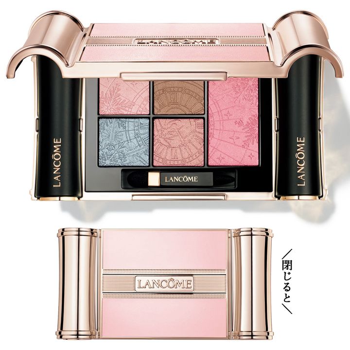 時計のエンボスが繊細に施されたカラーパレットのサイドには、ラプソリュ ルージュの現品サイズが2本もセット。組合わせしだいで何パターンものメイクアップが楽しめるので、ホリデーシーズンをフルで満喫できそう。ケースを閉じると、旅のお供に相応しい双眼鏡のようなデザインのパッケージもユニーク。ザ ピンク ジャーニー プレミアム パレット ¥20,900(ランコム)