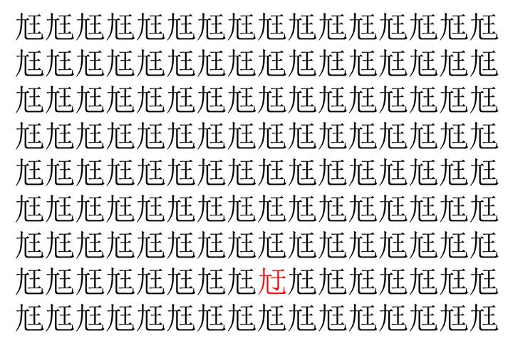 画像の中には、「尪」という漢字が縦に9行、横に16個並んでいます。 全部で144個となりますが・・・、そのうち1つは「異なる漢字」となってますよ!!