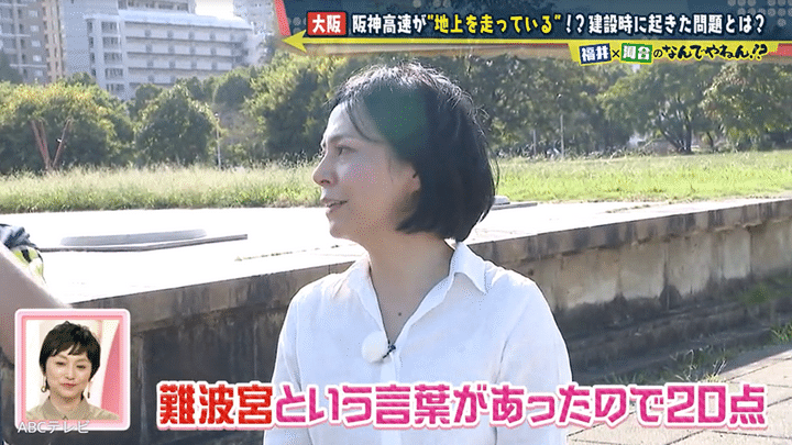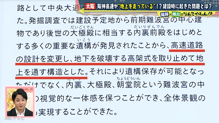 高架の橋脚を建てるために、地下の基礎工事は必要不可欠だ。しかしそれは、難波宮跡の破壊を意味する。つまり、阪神高速道路の一部区間が地上にある理由は、難波宮の遺構を保護するためだった。河合の余計な一言で高得点を逃したことに加えて、森さんのヒント「めちゃ近(=地下)」に気づけなかったことで、NDYは苦笑するしかなかった。